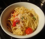 One night I threw together a pantry meal of spaghetti, sweeties, garlic, basil (also from the garden), olive oil and a dash of parmesan. I just boiled pasta, then sautéed and tossed. Easy, simple and delicious.