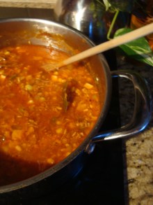 **Cook’s note: I had a leftover rotisserie chicken with most of the meat still on. I pulled off all of the chicken and set it aside. Then I removed and discarded all of the skin and icky bits, and put the bones in a pot. I covered them with water, added some salt and pepper and boiled for 30-45 minutes to make stock, which I used in the stew. Then I chopped all of the chicken into small pieces and added it to the stew pot. I also used a pound or two of shredded pork that I slow cooked awhile back in a homemade barbecue sauce. You could use ground beef, turkey, pork or chicken – just brown and drain it before you add it into the pot. If you’re using cooked chicken or pork, just chop it into a small dice first, and it will cook down and fall apart in the stew. (Hey, maybe this is a good way to use up Thanksgiving turkey! Note to self.) |