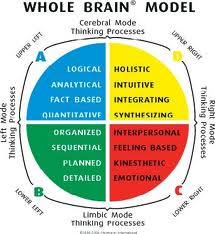 Before class even started, we took an online assessment called the Hermann Brain Dominance Index (HBDI). It’s supposed to show your thinking style — analytical, sequential, interpersonal or imaginative. Each of those styles is associated with a side of the brain (analytical/sequential = left, interpersonal/imaginative = right) and is assigned a color: