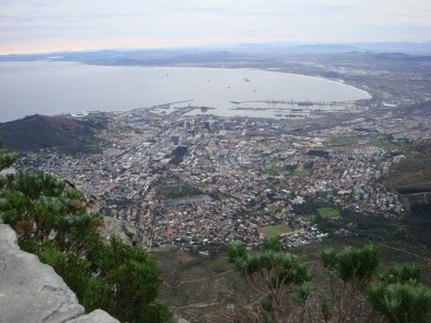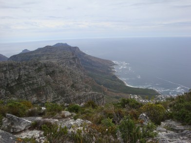 We headed first to Table Mountain, the flat mountain ridge that looms over the city. On a clear day, the views must be breathtaking. That day, the weather wasn’t bad enough to stop the cable cars from running to the top of the mountain, but it also wasn’t the sunny day you’d hope for after traveling halfway around the world.