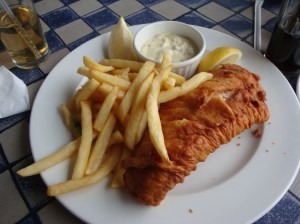 By this time, we were several hours past lunch and behind schedule. We were headed for the penguin colony, but Mark decided we should stop for lunch first because he was “afraid we might eat the penguins.” We stopped at one of the little towns along False Bay called Simons Town for a lunch of fish and chips at Bertha’s. South African ketchup really surprised us — it’s unique and unusual, with a strong spice component, maybe of cloves. I wasn’t a fan. For dessert, we shared a Malva Pudding, the traditional South African cake with custard sauce. We ate it every day for the rest of the trip. That first pudding was markedly different from the rest, though — more of a sticky toffee pudding with butterscotch sauce rather than a custard.