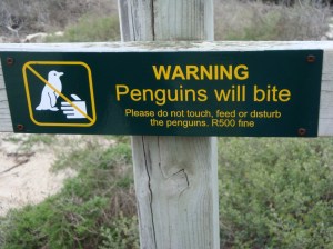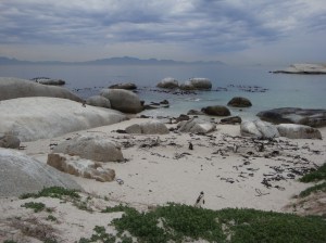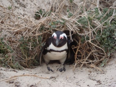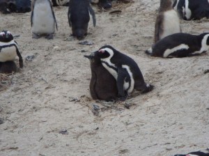 Leaving the restaurant, we encountered our first street market, and I successfully bartered for my first souvenir: a 35 Rand ($5) carved statue of entertwined giraffes. It’s cooler than it sounds, promise. We had to hurry over to the penguin colony before closing. The African penguins, which live there year-round, are also called “jackass penguins.” (Ha.) They were cute and little, if rather smelly, and they continuously called to each other, which made their little bodies convulse as they let out their shrieks. Aw. Like the baboons, penguins are apparently fierce enough to warrant plenty of warning signage, so we kept our appendages inside the barriers at all times.