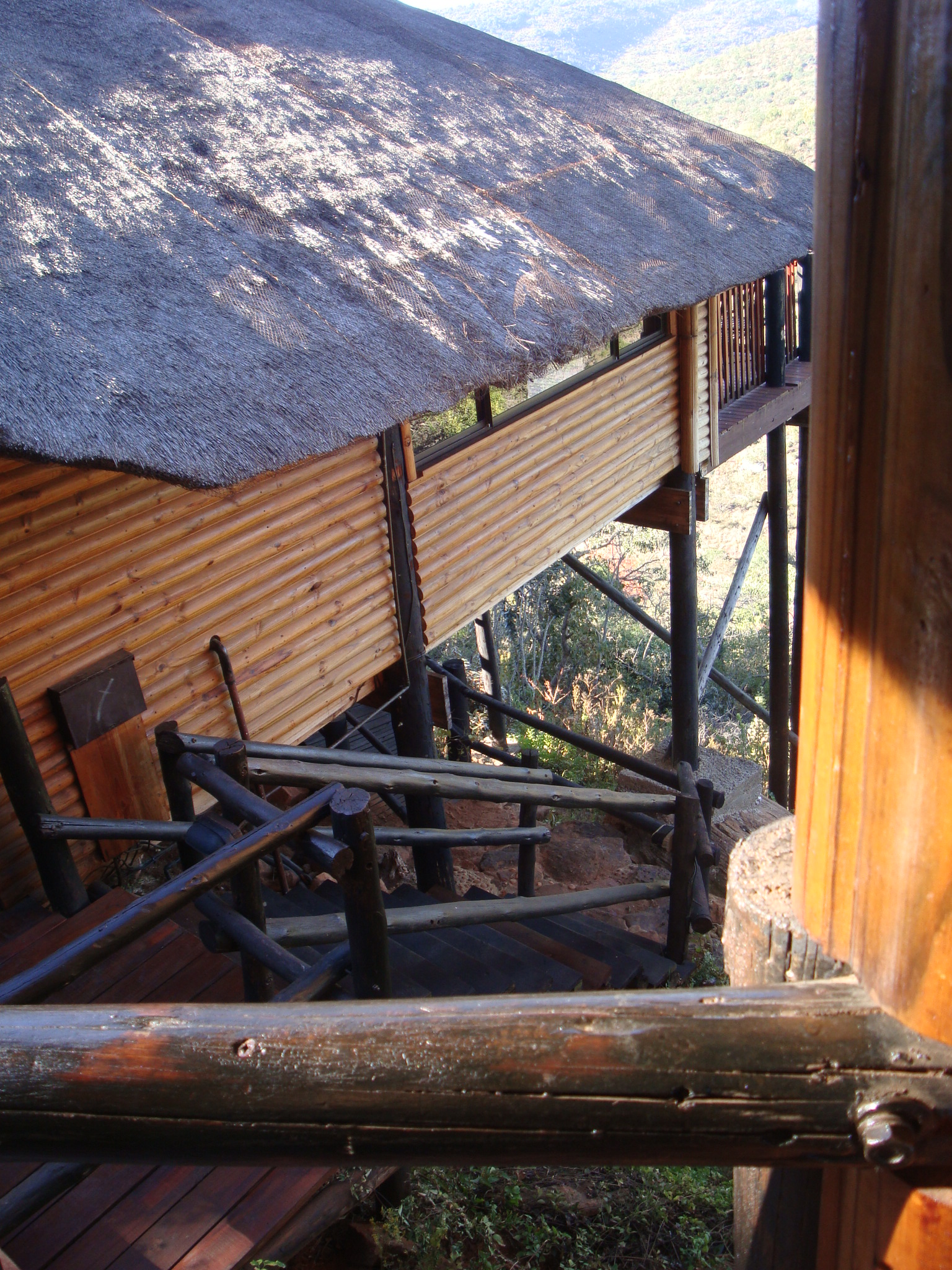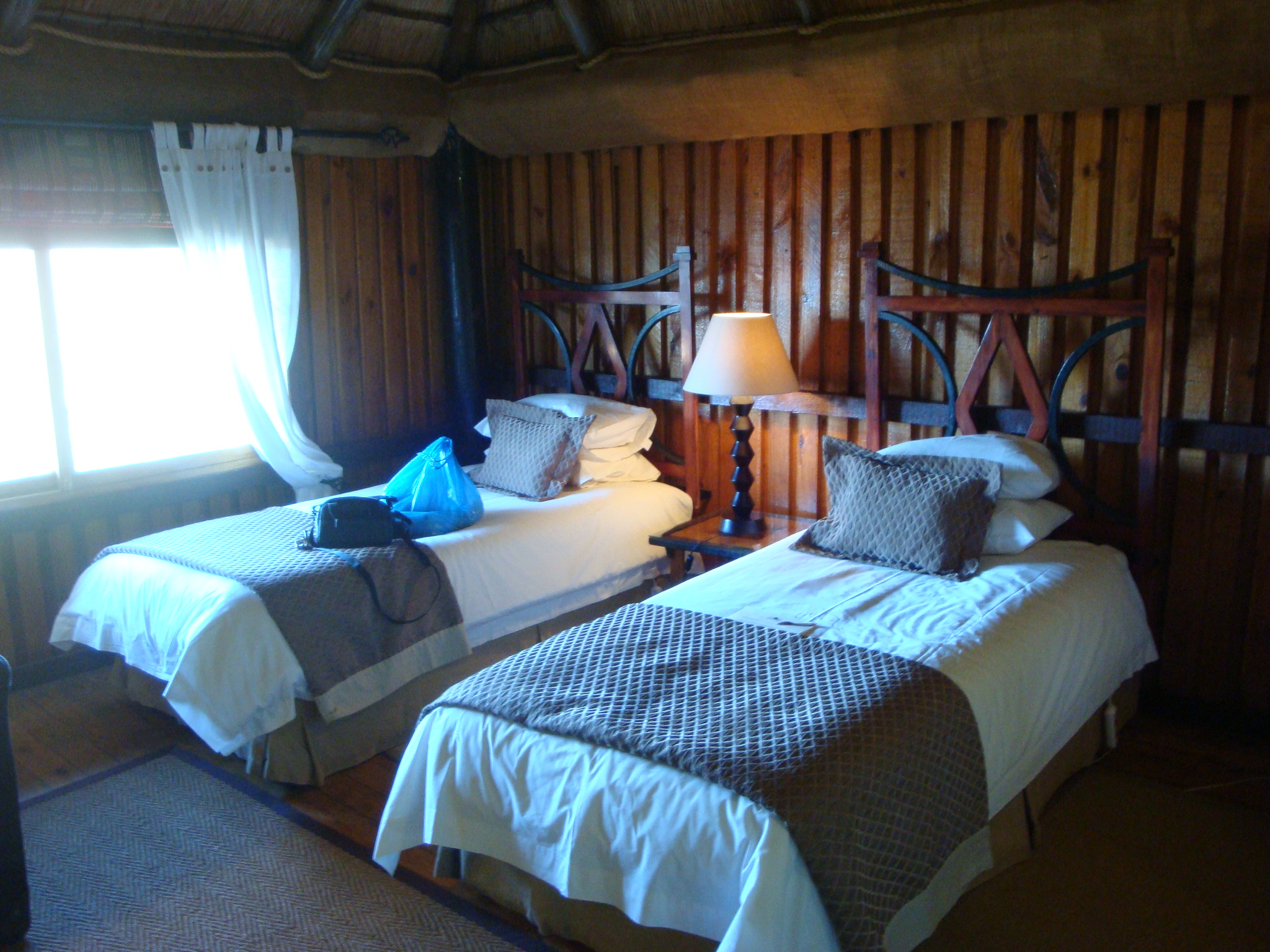 We rode to our rooms and explored our cabins. I may have mentioned that I don’t enjoy heights. Well, the lodges at Entabeni really tested me — they are basically perched on the side of a cliff, with a long wooden stairway that snakes its way from the top of the cliff to the rooms. I needed a Xanax just to make it to my door … and I’m not kidding. I really did take a couple, and prayed the whole way down. Once safely inside the room, we found a pretty rustic but well-furnished hut. The ceiling (well, roof) was thatch and windows looked out over the ravine. The floor pitched pretty heavily and there were a few small holes from which you could see to infinity, i.e. the bottom of the ravine. The shower only gave a trickle of water, which did nothing to warm us up from the chilly, dry weather. We were provided space heaters and heated blankets on the beds to keep it cozy. It definitely wasn’t the five-star accommodations of the Mount Nelson or Westcliff but it was still luxurious “roughing it.” Our luggage had been delivered to our rooms, and we proceeded to dress in everything we owned in preparation for our first, evening game ride. That’s long underwear, corduroys, multiple sweaters, socks, coats, hats and gloves. Because it was going to be chilly.