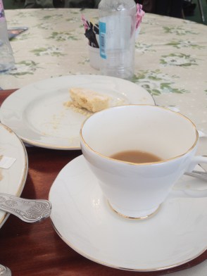 By the time I walked through that exhibit and out of the house, it was raining steadily. A cold, soggy, windy mess. I ducked into an enclosed tent that housed overflow from the tearoom and was able to order a hot lunch, with tea and shortbread. Pretty soon, I realized the rain wasn’t going to die down, but I also knew I couldn’t miss the occasion